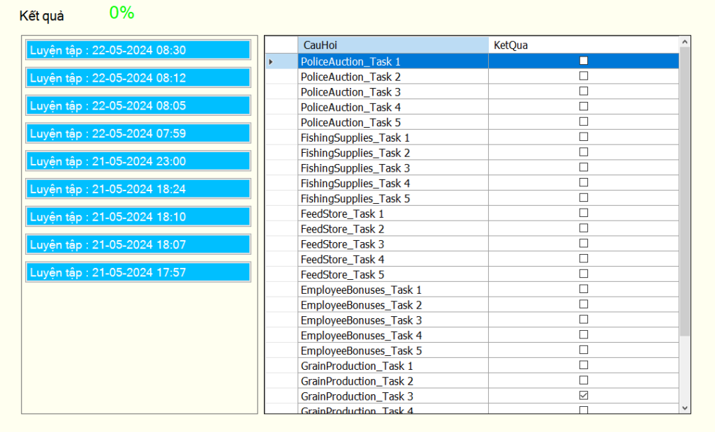 - Danh sách câu hỏi: Nhấn vào từng câu hỏi để thực hiện yêu cầu. Sau khi hoàn thành nhấn chọn câu tiếp theo để thực hiện yêu cầu khác.