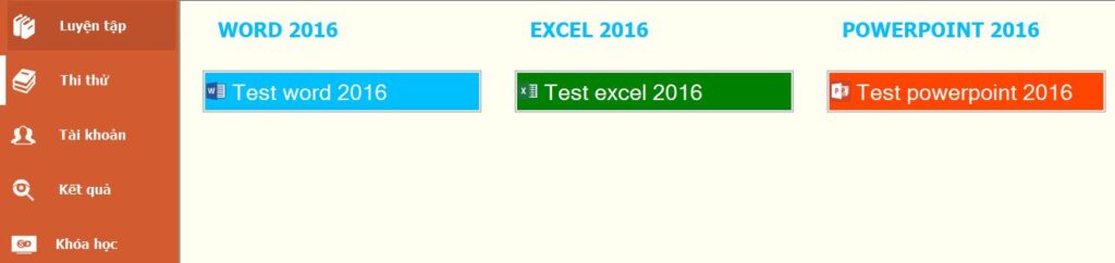 - Sau khi Luyện tập xong tất cả các bài ôn tập. Chuyển sang chế độ thi thử để làm quen với bài thi MOS.