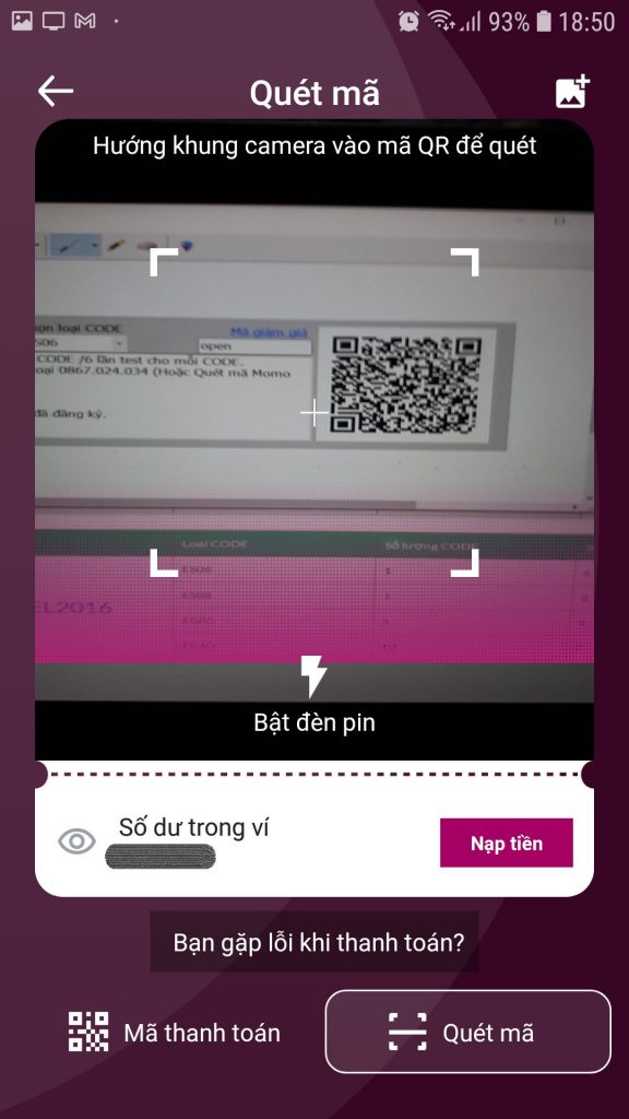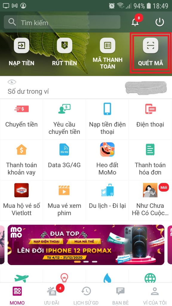 - Mở phần mềm MOMO trên di động sử dụng chức năng quét QR Code