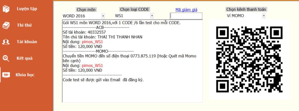 Sau khi nhập đầy đủ phần mềm sẽ hiển thị thông tin hướng dẫn thanh toán và QR Code MOMO.
